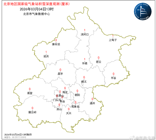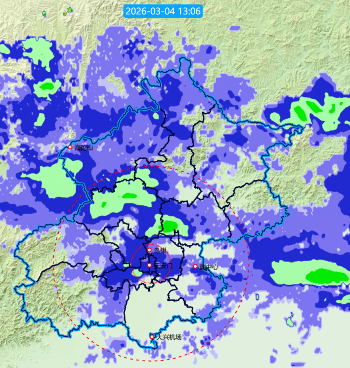 4日09时至13时,全市平均降水量0.6毫米,城区平均0.8毫米。最大降水出现在昌平大岭沟,2.5毫米。最近一小时(12-13时)最大降水强度出现在朝阳奥林匹克公园,0.2毫米。