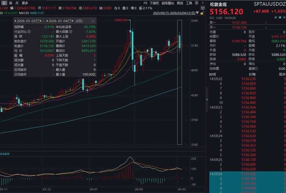 Wind显示,2月28日以来,国际金价震荡。3月3日,伦敦金现一度跌破5000美元/盎司,下探至4995.475美元/盎司;COMEX黄金盘中重挫,触及5005美元/盎司。3月4日,伦敦金现、COMEX黄金小幅回升,截至发稿重回5100美元上方。