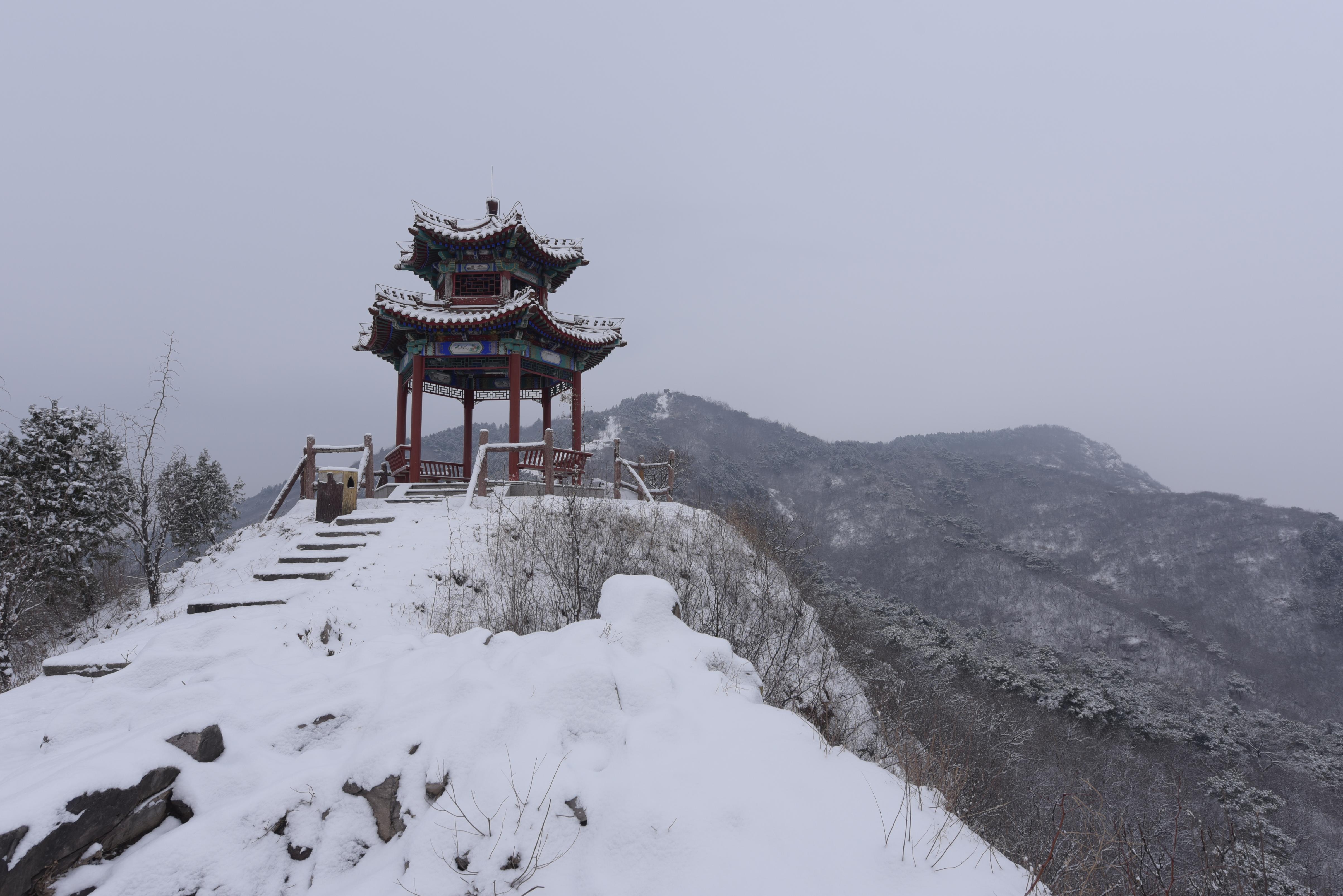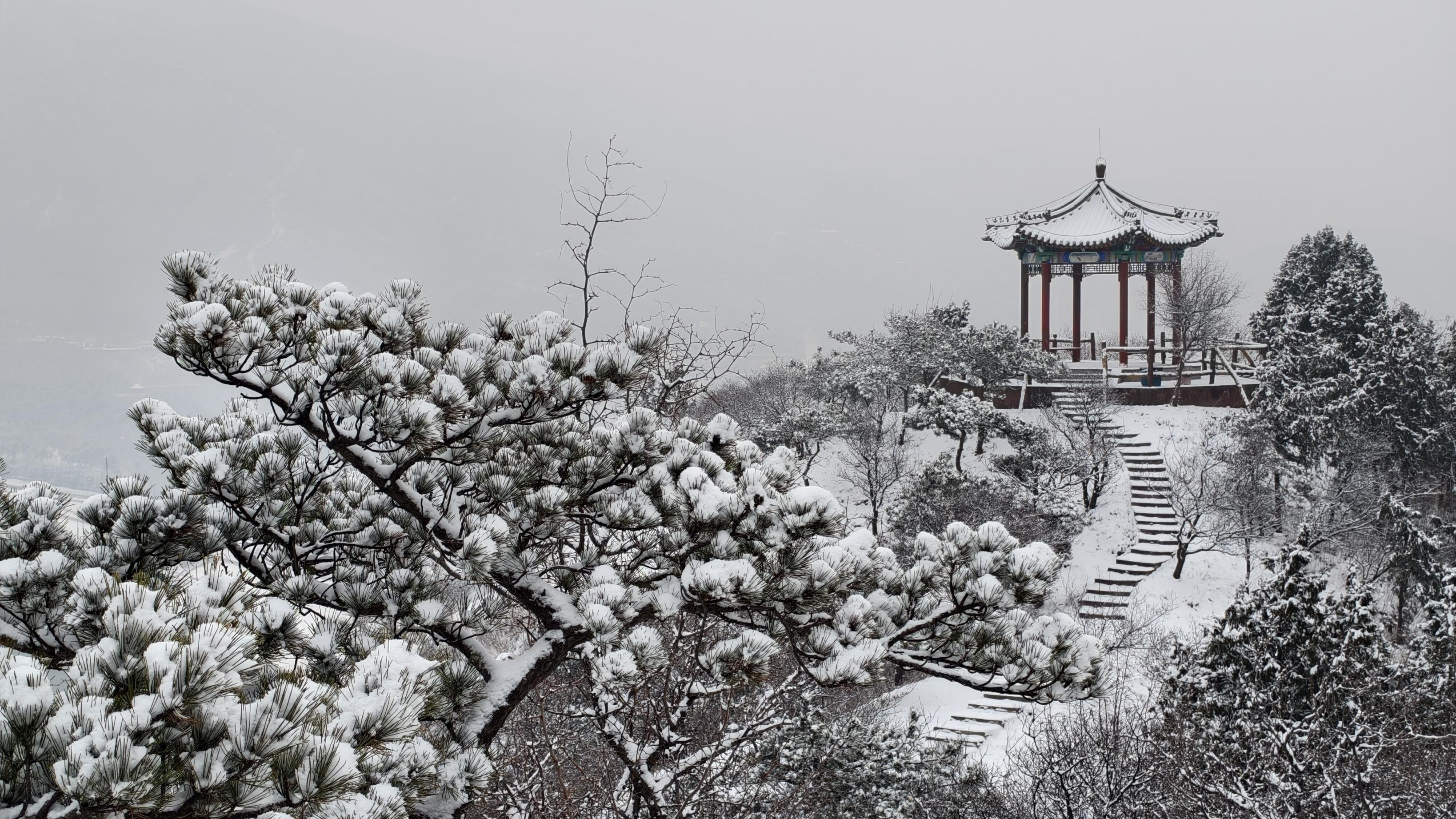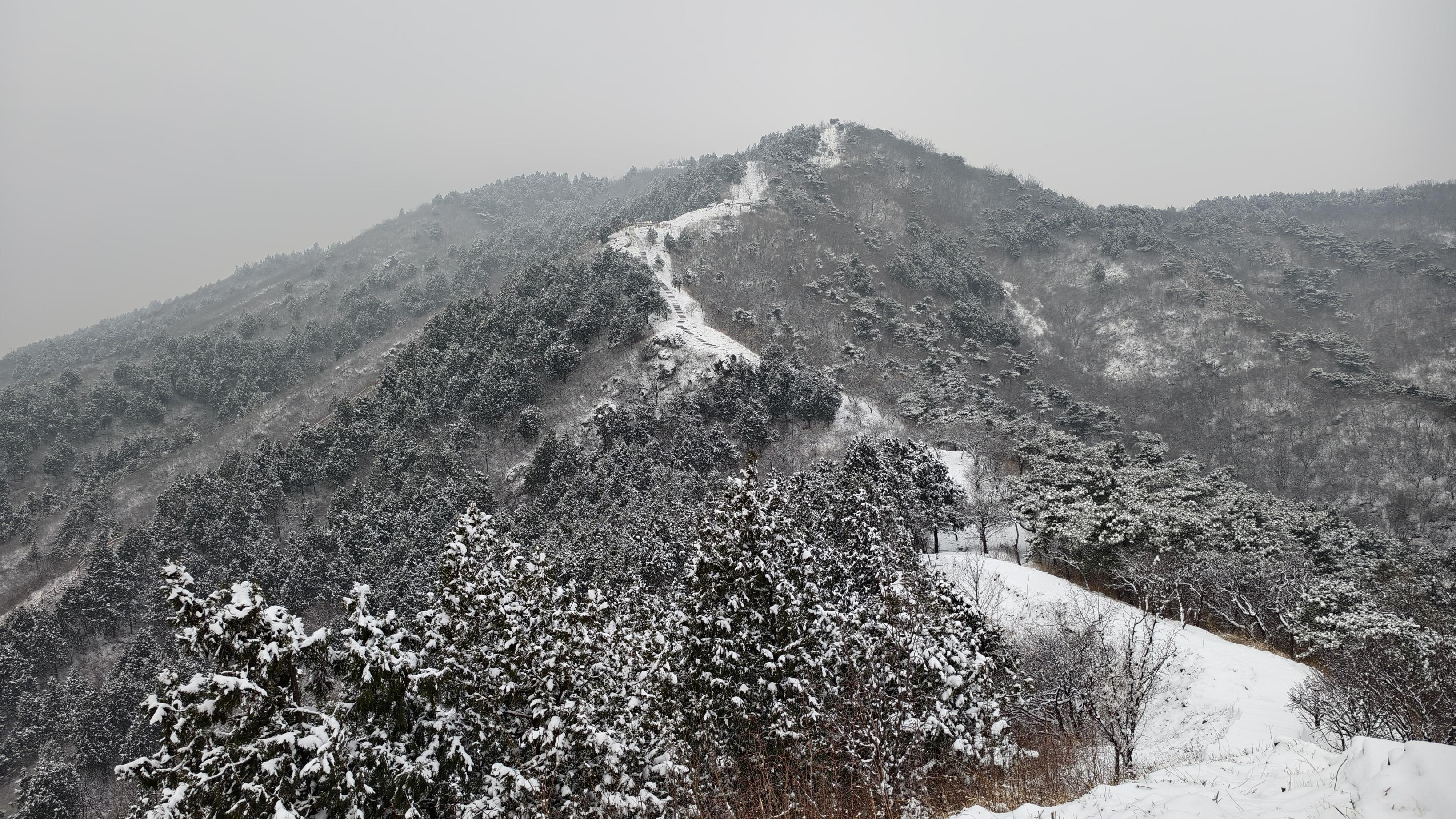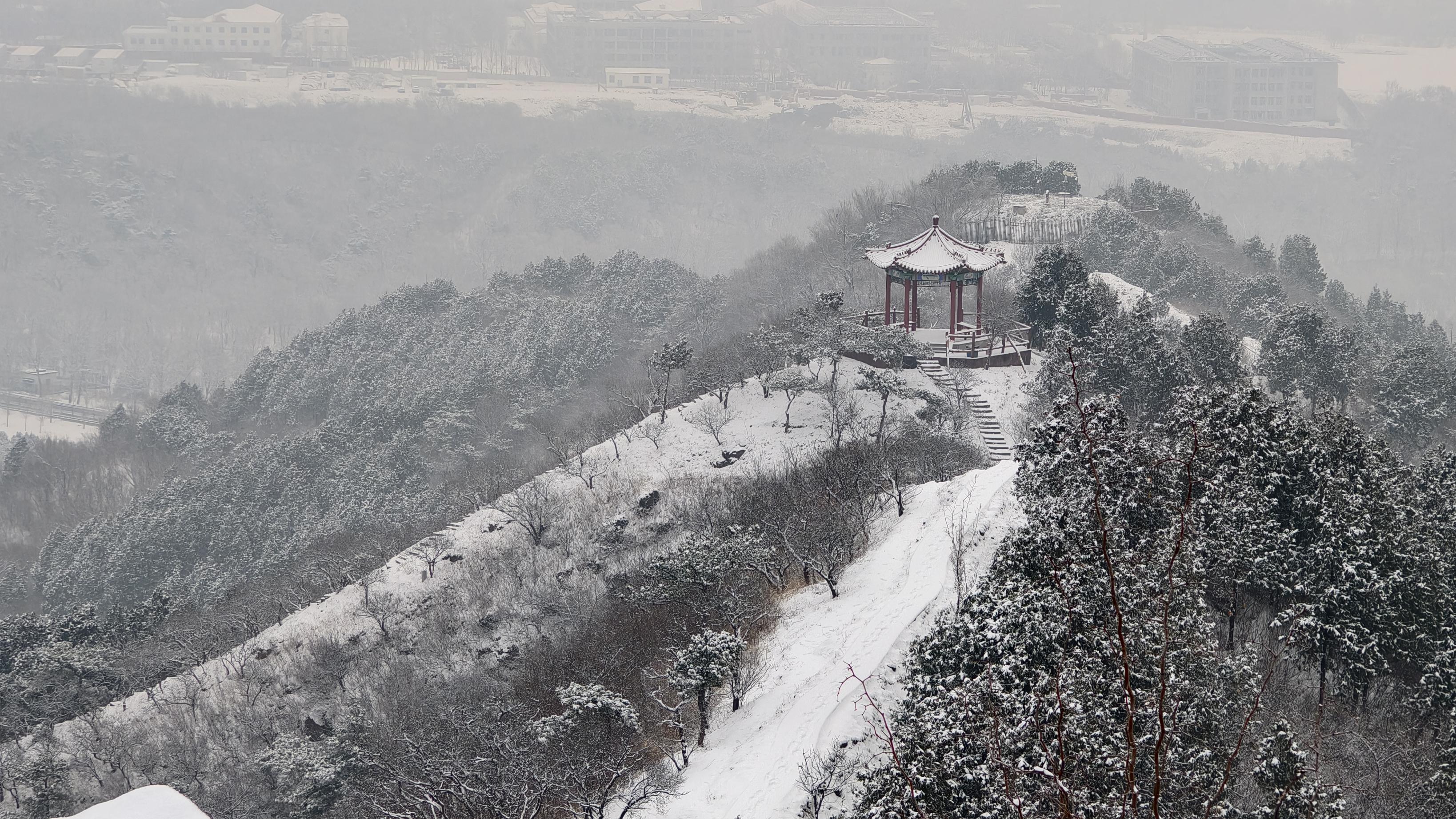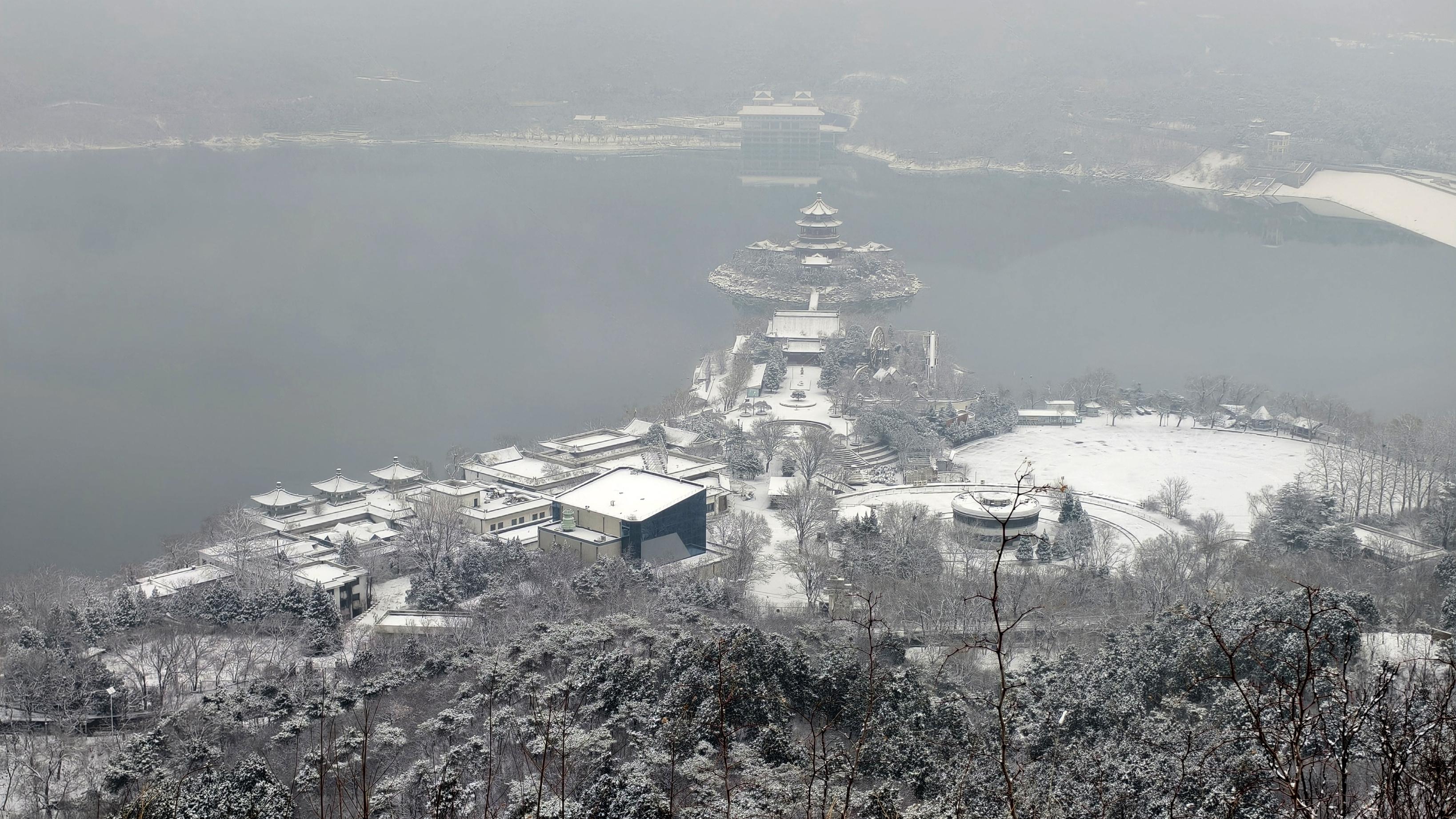 3月5日,一场大雪之后,北京昌平十三陵水库边的汉包山,登高望远,俯瞰水库全景,景色肃穆沉静。