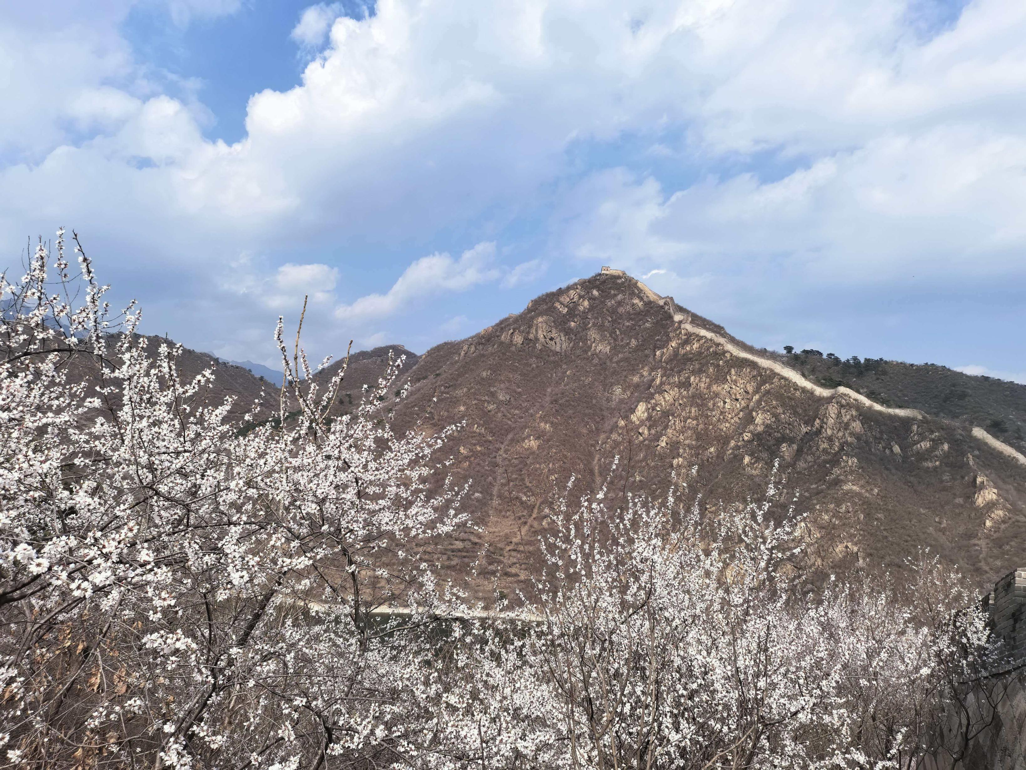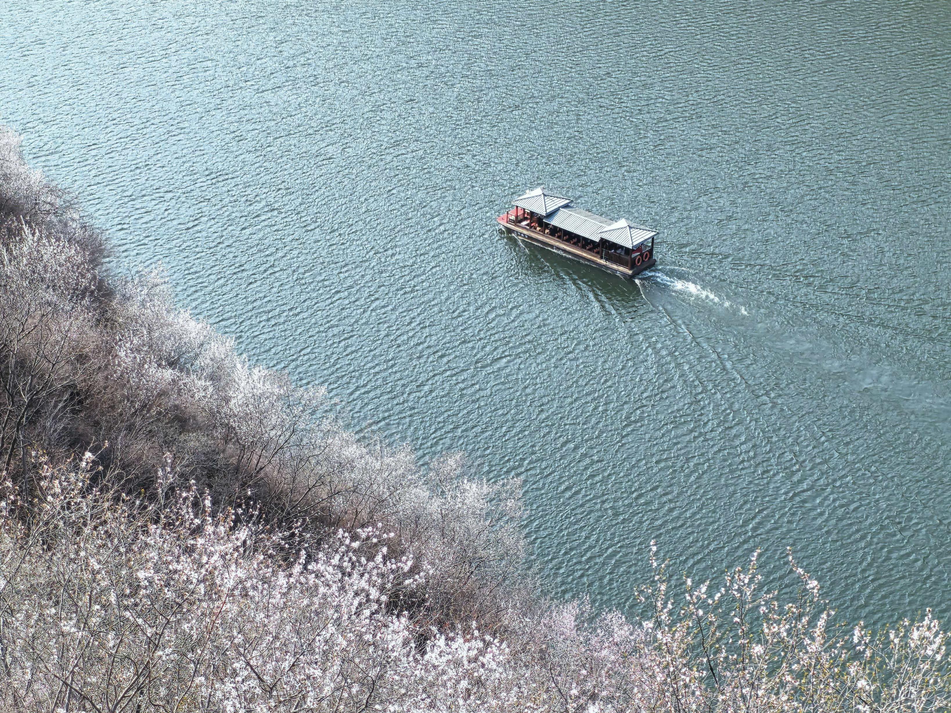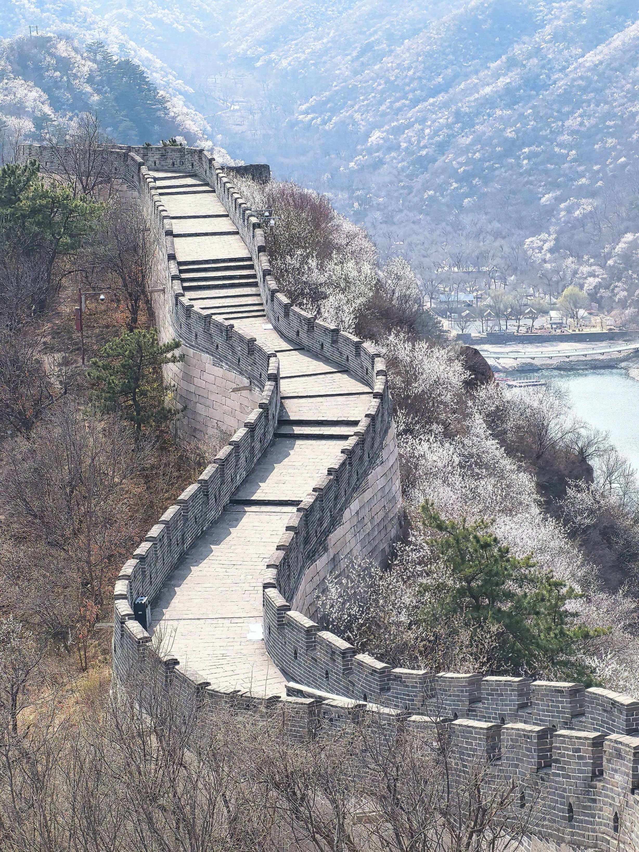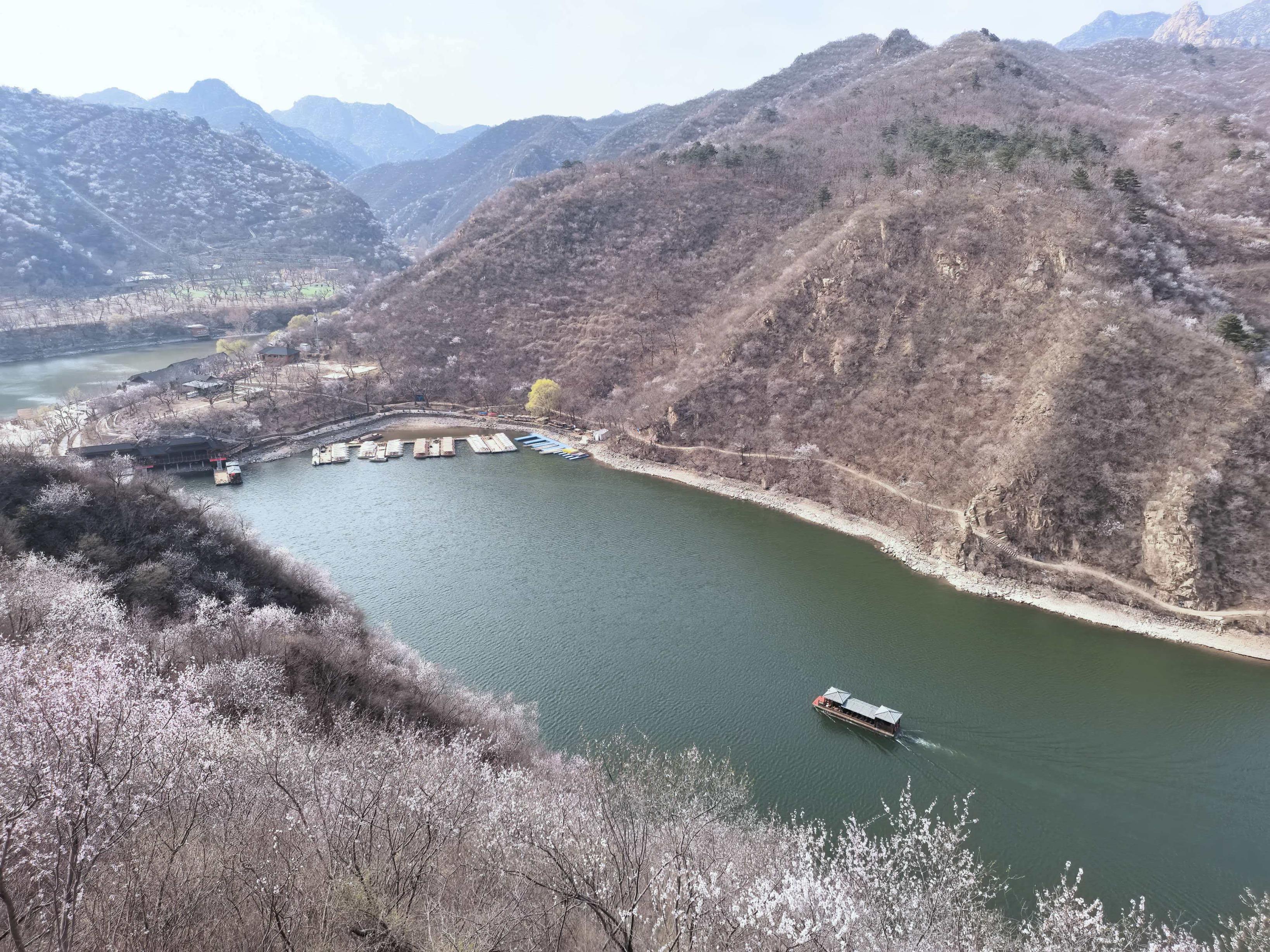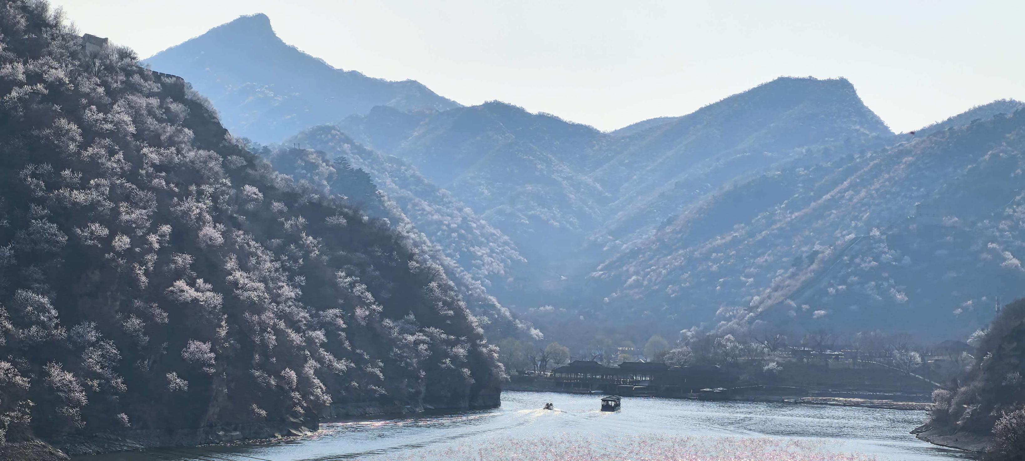 3月下旬至4月下旬,北京怀柔区九渡河镇西水峪村附近山林间,山桃花、杏花、梨花次第绽放,为黄花城水长城增添无限春色,令市民游客沉浸在花海山水长城美景之中。