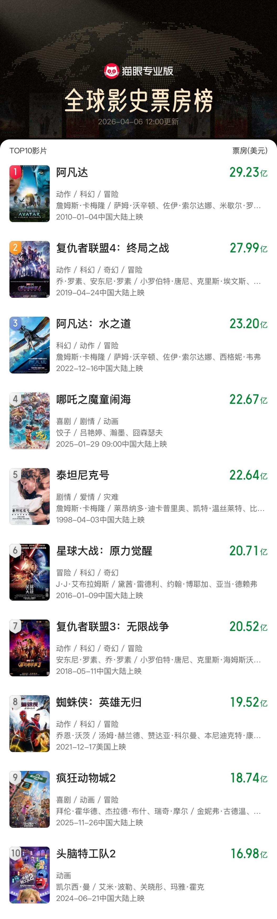据猫眼专业版数据,《哪吒之魔童闹海》全球票房超《泰坦尼克号》升至全球票房榜第4位。