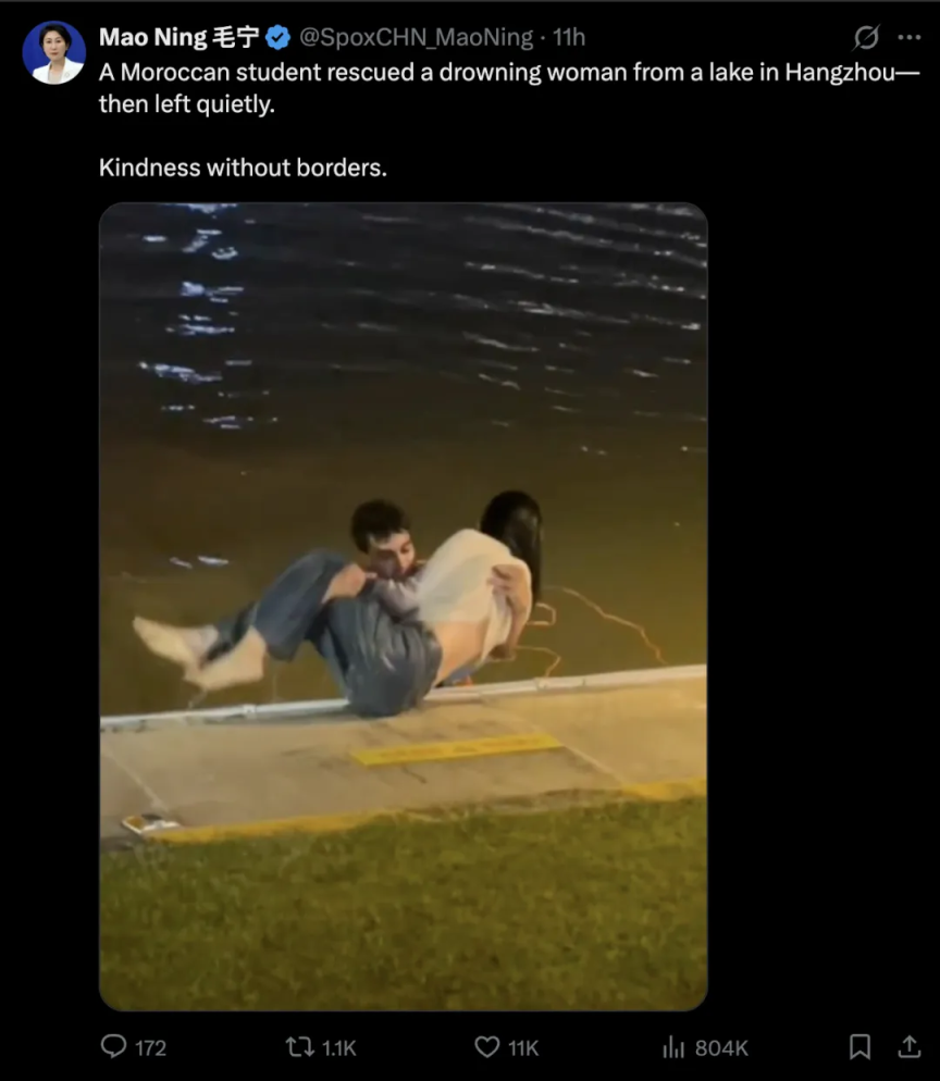 4月8日,外交部发言人毛宁在海外社交媒体分享了摩洛哥留学生在浙江杭州勇救落水女子的视频,并配文:“在杭州,一名摩洛哥学生从湖中救出一名溺水女子后悄悄离开。善良无国界。”
